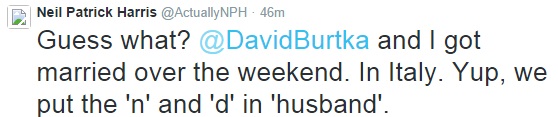 Hollywood actor, Neil Patrick Harris and his longtime partner David Burtka got married on Saturday September 6th at a very private wedding in Italy. The 'How I Met Your Mother' star took to twitter to make the announcement.