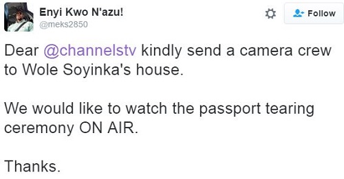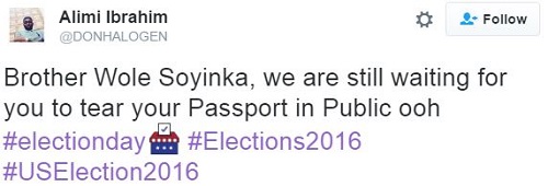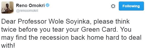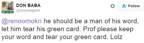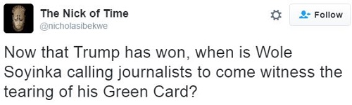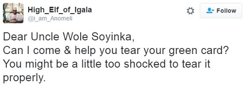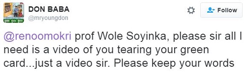 Many Nigerians on social media have called on Nobel Laureate, Wole Soyinka, to tear his green card. This is following the vow he made should Donald Trump become the president of the United States.