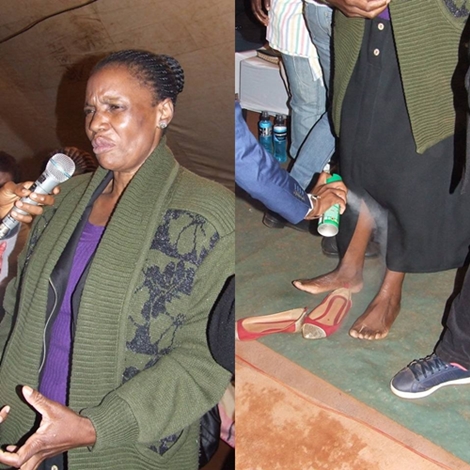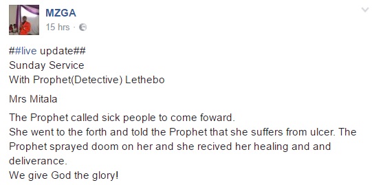 One photograph from Sunday was captioned: “Mrs Mitala. The Prophet called sick people to come foward. She went to the forth and told the Prophet that she suffers from ulcer. The Prophet sprayed doom on her and she recived her healing and and deliverance. We give God the glory!”