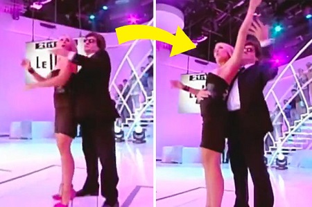 Wearing a strapless little black dress and stilettos, the woman was spun around by her male co-star before he flipped her backwards.