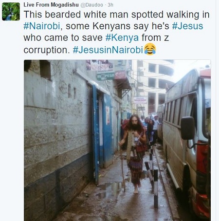 "This bearded white man spotted walking in #Nairobi, some Kenyans say he's #Jesus who came to save #Kenya from z corruption. #JesusinNairobi." a Twitter user wrote.