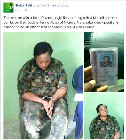 According to Facebook user, Bako Salihu, this woman with a fake Identity card was caught at the early hours of yesterday with 3 kids all tied with bombs on their body entering Abuja at Nyanya-Mararraba check point