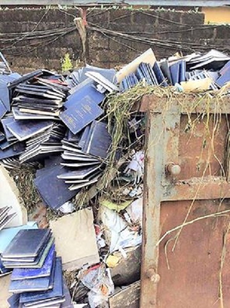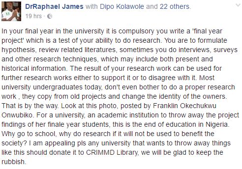 The photo was shared on Facebook by one Dr Raphael James, who was furious with the unnamed institution that had the nerve to discard academic works of research in such a horrible manner.