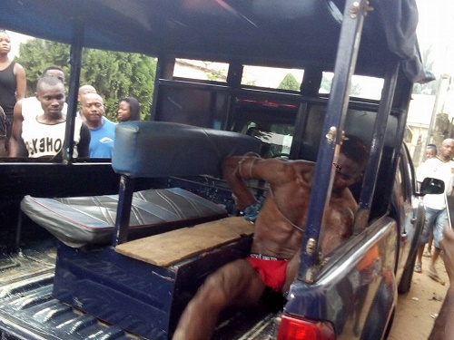The angry mob used weapons to beat the criminal and tied his hands. He was beaten and was about being set ablaze before people begged on his behalf. After that, he was handed over to the police.