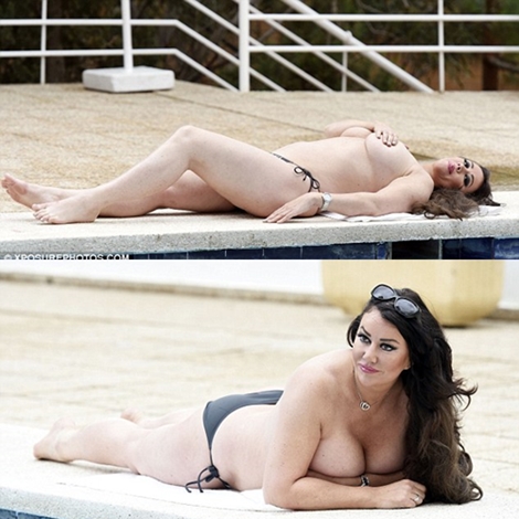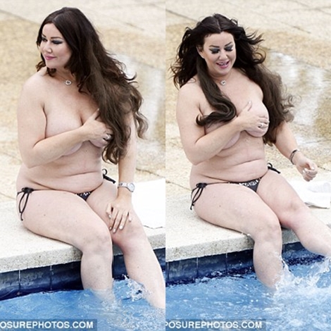 The ex-Big Brother UK house-mate, was pictured flaunting her famous curves for all to see and protected her modesty with her hands as she soaked up the remnants of the Spanish sunshine by the pool.