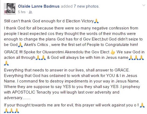 I thank God for all because there were so many negative confession from people I least expected cos they thought the words of their mouths were enough to change the plans God has for d Gov Elect,but God didn't seize to be God Aketi's Critics , were the first set of People to Congratulate him!