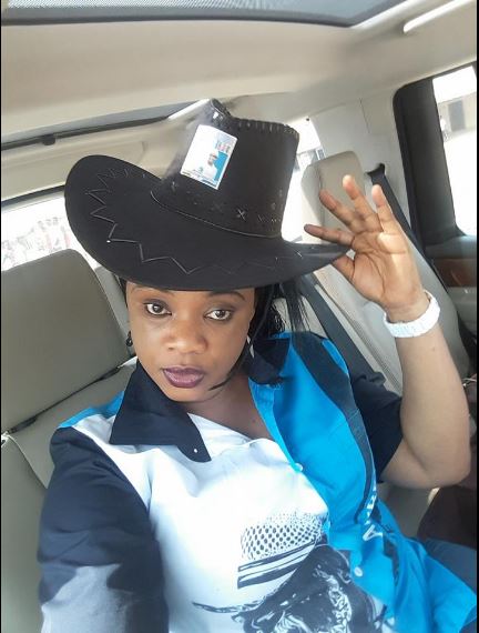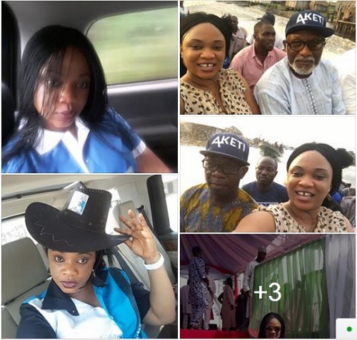 The light-skinned beautiful woman with a gap tooth expressed gratefulness to God as she shares a couple of photos from the Akeredolu campaign train.