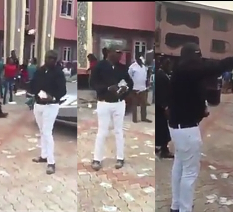 A video clip which emerged online some hours ago and is currently making rounds on social media, show the moment a popular Malaysia-based Nigerian man, was captured on camera spraying money endlessly to announce his arrival at an event in Anambra State, upon his return to the country.