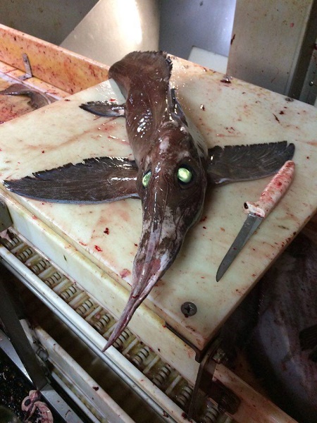The alien fish with green eyes looks like a knifenose chimaera fish