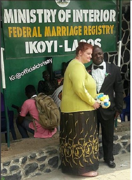 "Ba mi dupe luwo oluwa ooo.. Mo ti fe oyinbo, jesu seun" (Help me thank God, I've married a white). Those were the words of this young man while receiving a phone call, just after tying the knot with this white woman at the Ikoyi registry earlier today.
