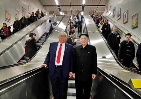 An unlikely scene greeted people in Hong Kong this morning as American president Donald Trump and North Korean dictator Kim Jong Un hugged and leaned in for a kiss on the city streets.