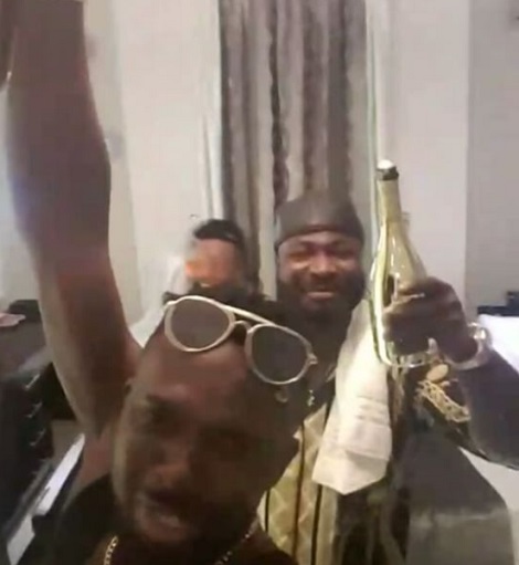 Reggae Blues singer, Harrysong celebrates victory over his former record label, Five Star Music as he pops the luxury gold bottle champagne after his arrest.