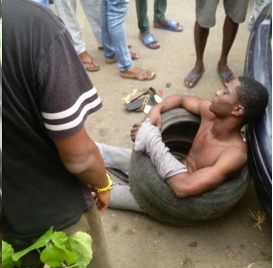 An alleged notorious thief who would have been burning in hell right now, has been rescued from being burnt alive by an angry mob at the Ajao estate area of Lagos state, after he was caught in crime.