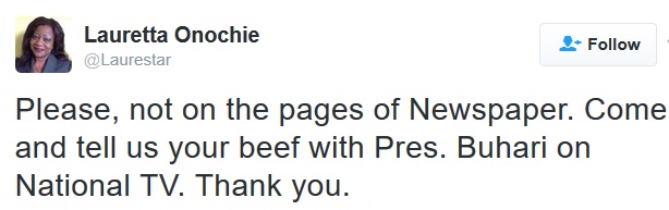 Come on National LIVE TV and tell us your beef with President Muhammadu Buhari and where he went wrong...a presidential aide, Lauretta Onochie, has challenged 2Baba.