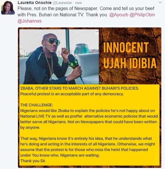 President Muhammadu Buhari’s Personal Assistant on Social Media, Lauretta Onochie, on Tuesday night, has challenged multi-award winning R&B singer, Innocent Ujah Idibia a.k.a 2Face over his planned nationwide massive protest against the APC-led federal government.