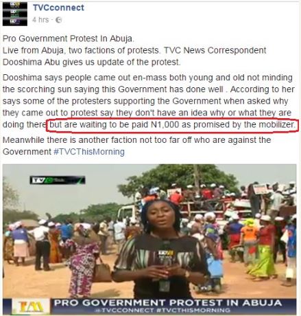 Dooshima Abu, a TVC news correspondent in Abuja has alleged that the Pro-Buhari activists were promised a cash reward of N1,000 by an unidentified mobilizer to join today's rally.