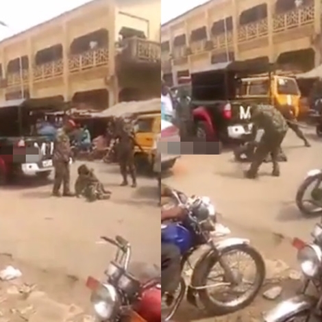 A shocking video has emerged online showing the moment officers of the Nigerian military dragged out a crippled man from his wheelchair, threw it away, and beat him mercilessly for allegedly wearing a camouflage on Tuesday, at Onitsha the commercial city of Anambra state.
