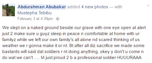 "We slept on a naked ground beside our grave with one eye open at alert just 2 make sure u guyz sleep in peace n comfortable at home with ur familyz while we left our own family's all alone nd scared thinking of us weather we r gonna make it or nt. Bt after all diz sacrifice we made some bastards will said dat soldiers r nt doing anything, okey y don't u come n do wat we can't ..... M just proud 2 b a professional soldier HUUURAAA" *sic*, he shared.