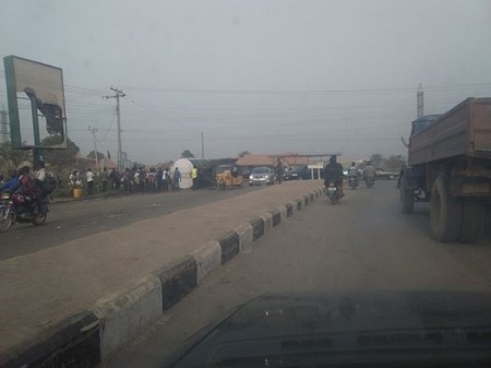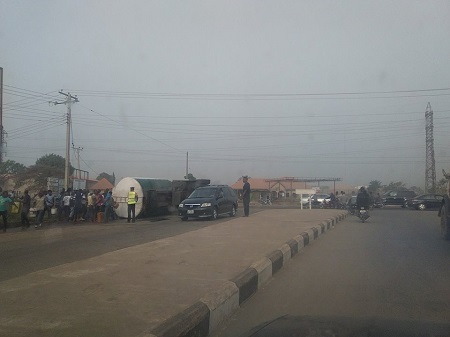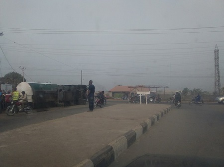 Few minutes ago, a Fuel Tanker that negotiated the bend lost balance and has fallen by the side.