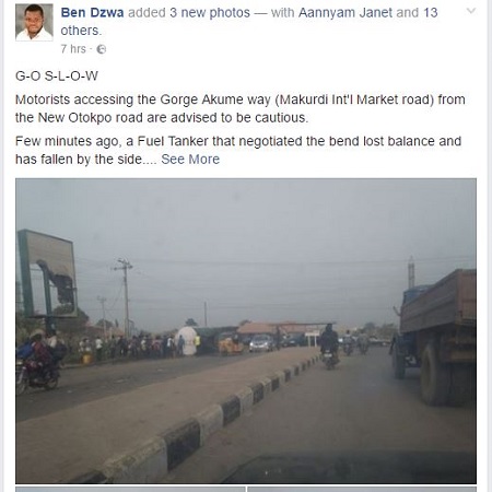 "Motorists accessing the Gorge Akume way (Makurdi Int'l Market road) from the New Otokpo road are advised to be cautious.
