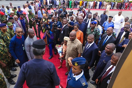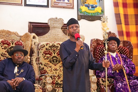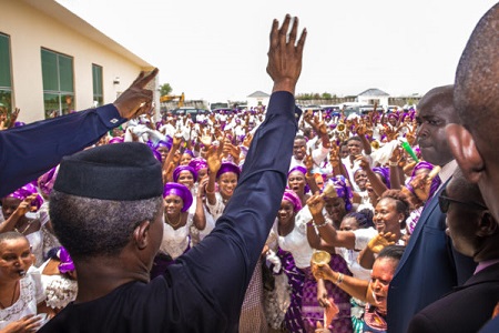 Acting President Professor Yemi Osinbajo arrived Bayelsa today to continue the Federal Government’s policy of engagement and dialogue with the people of Niger Delta. Osinbajo was welcomed by a large crowd of well wishers who trooped out en mass wearing different colourful dresses.