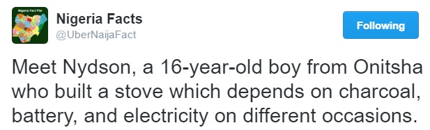 According to photos shared on Twitter by @UberNaijaFact, a 16-year-old boy simply identified as Nydson, from Onitsha, the commercial city of Anambra state, has built a stove which depends on charcoal and battery.