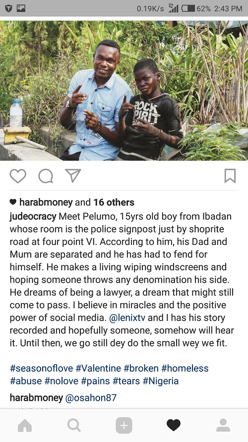 "Meet Pelumo, 15yrs old boy from Ibadan whose room is the police signpost just by shoprite road at four point VI. According to him, his Dad and Mum are separated and he has had to fend for himself.
