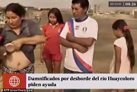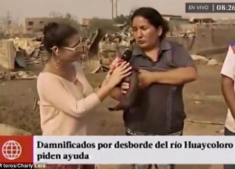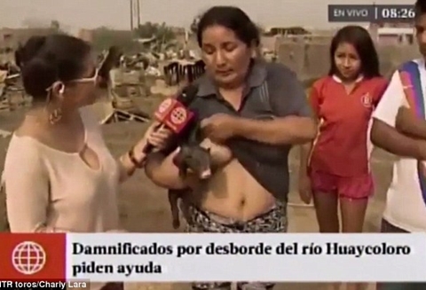 A Peruvian woman who was being interviewed by a reporter on a farm and being questioned about the heavy rain and floods and its effect on local business, has done the unbelievable after she was seen on camera breastfeeding a pig.