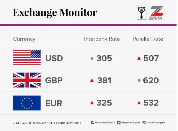 These are the currency exchange rates for today, February 15, 2017, powered by Zenith Bank Plc. The greenback which exchanged for N500 with a dollar yesterday has dramatically fallen to N507 today.