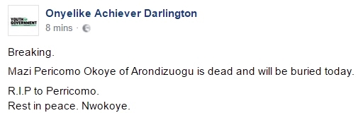 A Facebook user, Onyelike Achiever Darlington, has taken to the social media platform to announce the passing away of legendary Igbo musician and traditionalist, Ichie Mezuo Pericomo Okoye, Arusi Makaja 1, a.k.a Pericoma.