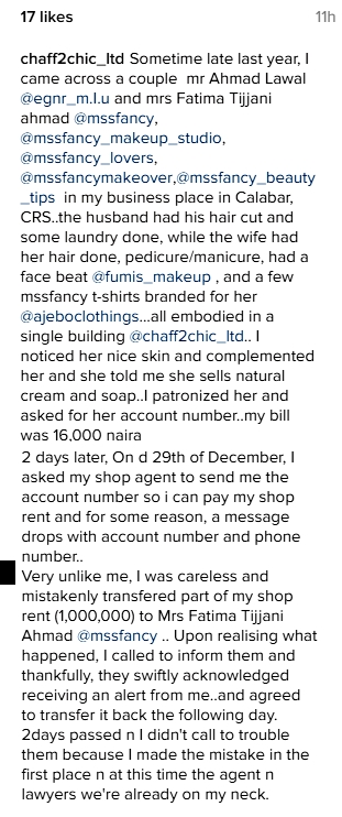 A female Instagram user, @Chaff2chic_ltd, has taken to the social networking site to call out a Kaduna-based cream seller identified as Miss Fancy for refusing to refund her money after she mistakenly transferred N1 million instead N16,000 to her bank account.