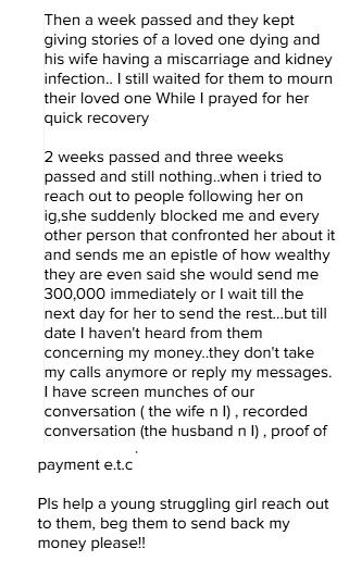 According to her, she sent the money on the 29th of December, 2016 and hasn't gotten back a dime till now. The said lady has even blocked her and anyone who tries to question her about the money.