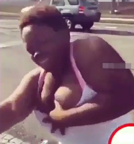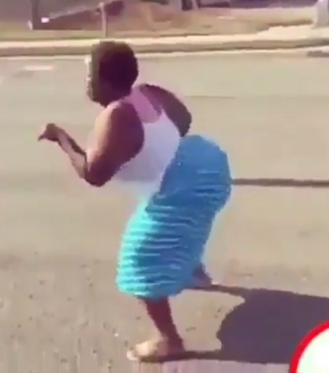A very happy lady who decided to dance and twerk with her big bum in the middle of the road, has ended up running to cover up herself after her boobs accidentally popped out from her dress.
