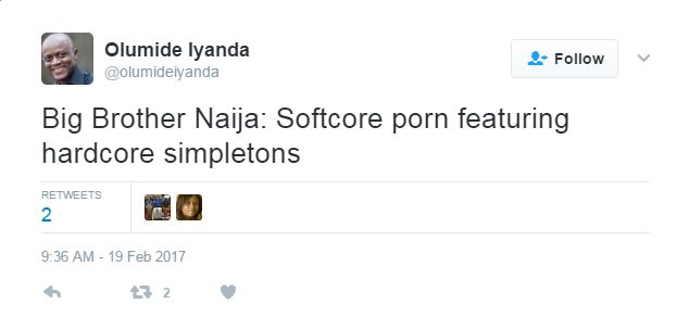 But so far, this year’s Big Brother Naija has been nothing other than – as journalist Olumide Iyanda aptly put it on Twitter, soft porn featuring hardcore simpletons.
