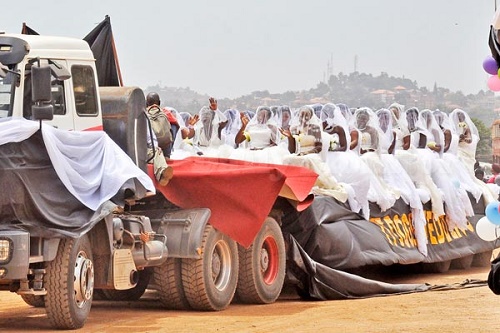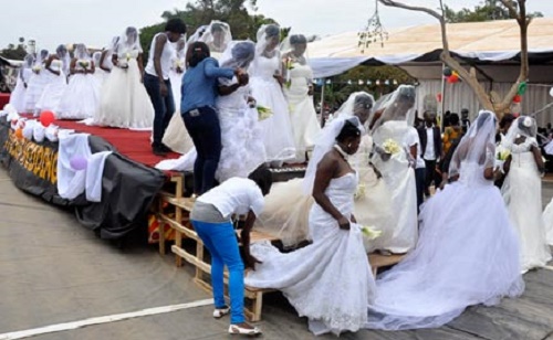 It was a thrilling experience as 200 brides were joined in holy matrimony after riding on the back of a trailer.