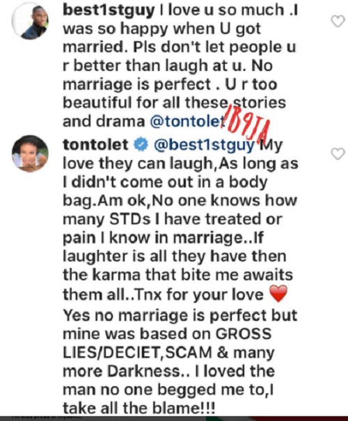 Tonto Dikeh made the shocking confession while replying a comment in which a fan had expressed his love for her:
