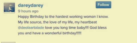 Deola Ayeni wife of popular Nigerian Musician Dare Art Alade is a year older today and her husband was so happy and decided to write a lovely message for her.