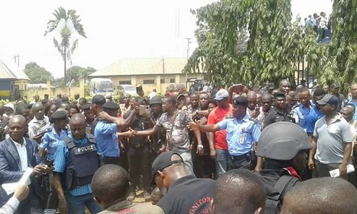 Crowd Gathers as Corpse of the Notorious Kidnapper, Vampire and His Gang Members Arrive Imo State Police Headquarter (Photos)