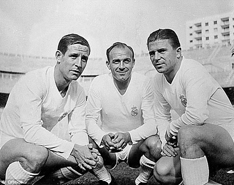 Kopa (left) played with Alfredo Di Stefano (centre) and Ferenc Puskas (right) at Real Madrid