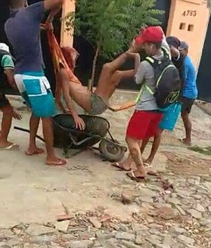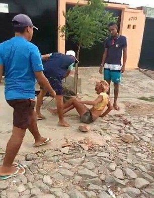 The person who filmed the clip is heard saying in Portuguese 'they will kill the f*****' and laughing while the attackers make cruel taunts about her hormone-therapy induced breasts and hurl homophobic insults.