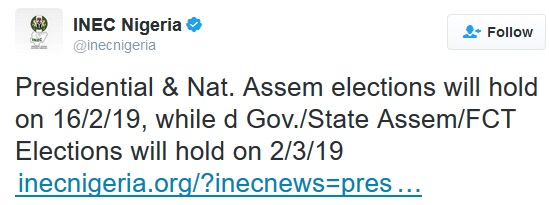 In an official statement posted on its website on Thursday, the Independent National Electoral Commission, INEC, has announced dates for 2019 general elections.