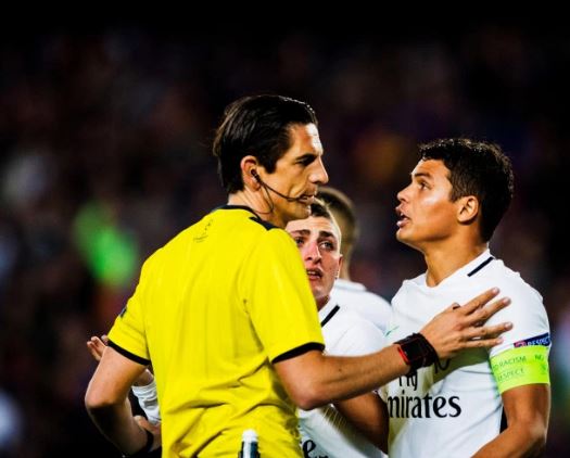 Marco Verratti and Thiago Silva argue with Deniz Aytekin