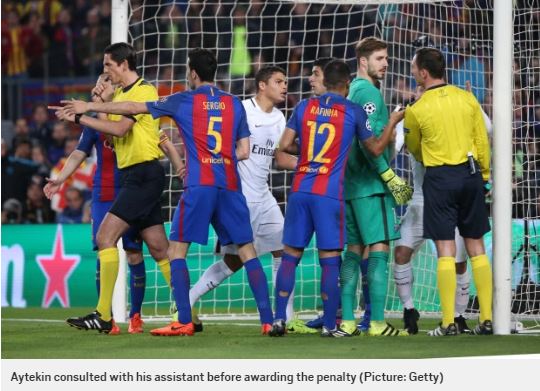 The penalty decision that put Barcelona within a goal of pulling off the unlikely fightback was controversial as Luis Suarez went down under minimal contact. Aytekin pointed to the spot much to the fury of the PSG players who had already seen the referee book Suarez for diving earlier in the game.