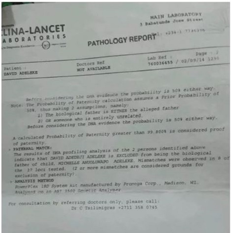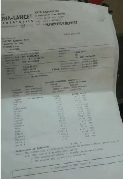 But then, a copy of the test carried out at Clina-Lancet Laboratories, Babatunde Jose Street, Victoria Island, Lagos on September 2, 2014, showed that Davido was ‘excluded’ from being the biological father of the child.