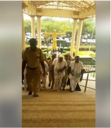 Nnamdi Kanu like his supporters and defendants rocked similar white Jewish attires as they awaiting the court hearing today.