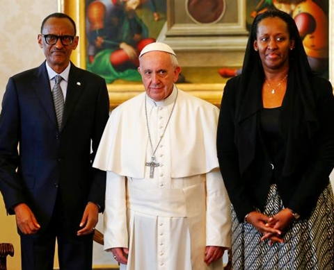 Pope Francis poses with Rwanda's President Paul Kagame and his wife Jeannette during a private meeting at the Vatican March 20, 2017