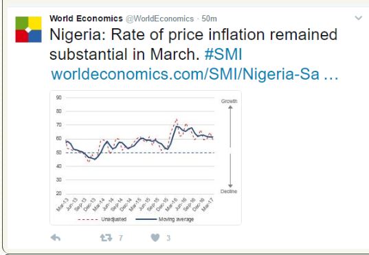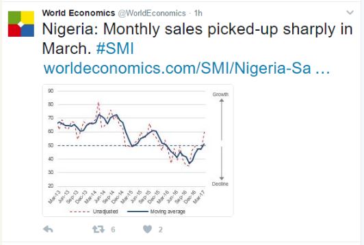 "March Sales Managers’ Index (SMI) data suggests that the Nigerian economy is starting to grow out of the recession which saw 10 months of consecutive contraction. The Market Growth Index grew to 53.5 in March as the monthly Sales Growth Index edged up to 51.3, its highest value since March 2016.