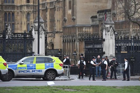 an assailant shot at the parliament after ploughing a car into pedestrians before stabbing a police officer outside the Palace of Westminster.