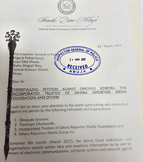 Influential politician and chieftain of the ruling All Progressives Congress, APC, Senator Dino Melaye, has filed an official petition against Sahara Reporters to the Inspector General of Police, IGP.