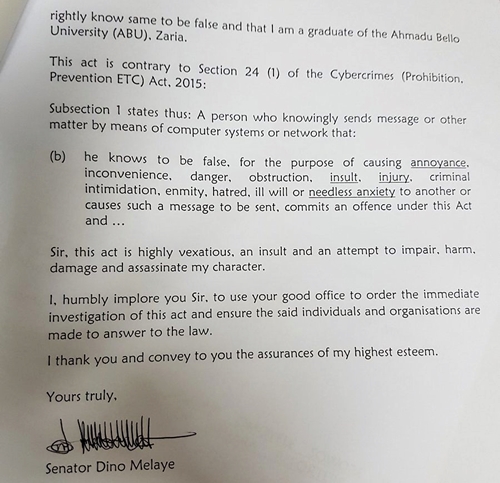 The outspoken Senator representing Kogi West Senatorial District, Dino Melaye who on Thursday, 23 March, filed a N5 billion libel suit against an online media platform, Sahara Reporters over a certificate scandal, has taken the media war to another level after he posted his official petition against the outfit to the Inspector General of Police (IGP) on social media.